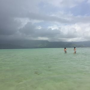 この日はあいにく朝から雨が降ったり止んだりでしたが、出航後は少し晴れてツアーを楽しむことができました。ガイドのお姉さんは元気いっぱいでそのテンションにお客さんが若干ついていけてない感じもありましたが(笑)子連れの私たちを気遣ってくれてありがたかったです。出航するとまずウミガメウォッチングですが、ウミガメはイルカより小さく水面に出るのが一瞬なので泳いでいるカメは私は見られませんでした。ですが運よく甲羅干し中のカメたちがいて、しっかりと写真に撮ることもできました。サンドバーは潮がそこそこいい日だったので水深は足首~ふくらはぎくらい。陸地から離れた場所に立っている不思議な感覚が味わえました。写真撮影後、私は幼稚園児の娘とサンドバーに残りましたが夫と小学生の子供はシュノーケルへ。シュノーケル組はガイドさんたちと一列になって泳ぐのですが、前の人たちがなかなか進まず後ろの方はかなり渋滞して、手足がぶつかったりと大変だったとのことです。参加者の泳力の問題もあるので仕方ないとは思いますが、もう少しフリーで泳げたらよかったなぁと思います。シュノーケルは少し残念でしたが、他は楽しくいいツアーに参加できたと思います。ありがとうございました。