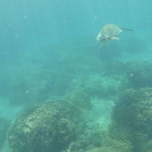 シュノーケリングの後はウミガメ観察に行きます。たくさんいて、その中には巨大なものもいます。