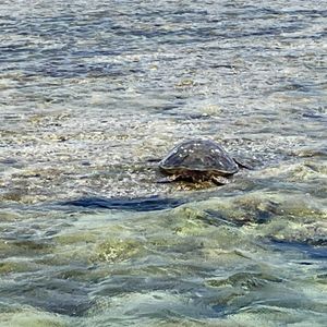 珊瑚礁の浅瀬で息継ぎをするウミガメを船上から眺められます。結構な数が見られ、船のすぐ近くにも来てくれてスマホでも十分写真が取れました。