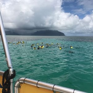明るく楽しいガイドさんでハワイらしい雰囲気満点のクルーズ、途中ジュラシックパークの撮影場所の説明なども聞きながら進んでいくと、ウミガメもしっかり何度も現れてくれて感激しました。