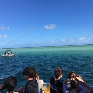 快晴の中サンドバーへ。この時期は水位が腰位まであり、テレビで見るような砂の上を歩くことはできませんでした。その分シュノーケルではカラフルな魚やウミガメと一緒に泳ぐことが出来、大いに盛り上がりました。