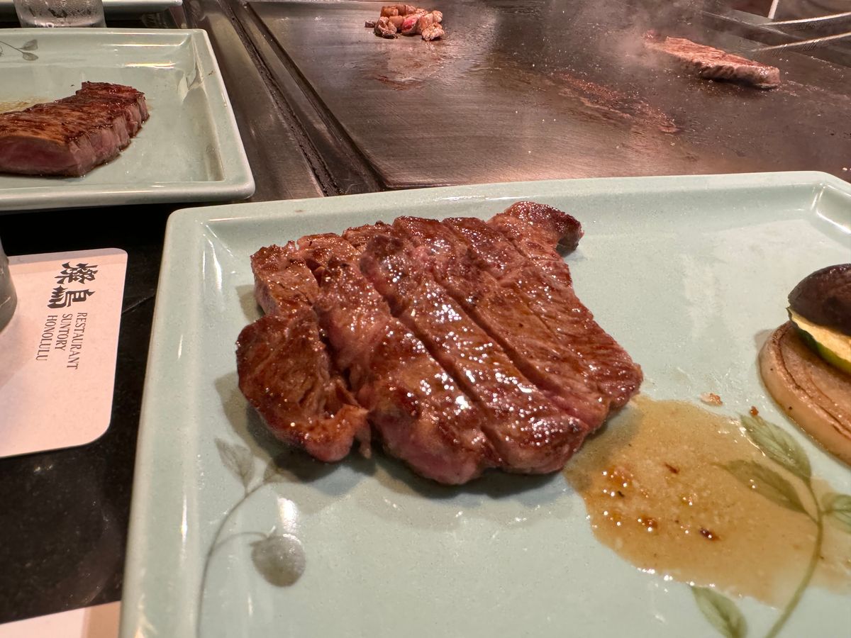 ハワイの食事料金が非常に高い中で、ちゃんと目の前の鉄板で調理してくれる、比較的手軽にステーキディナーを取れる店で、雰囲気も落ち着いていて良かったです。