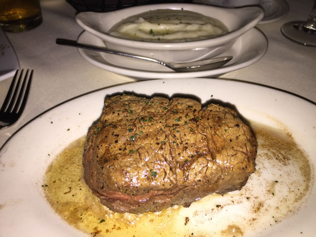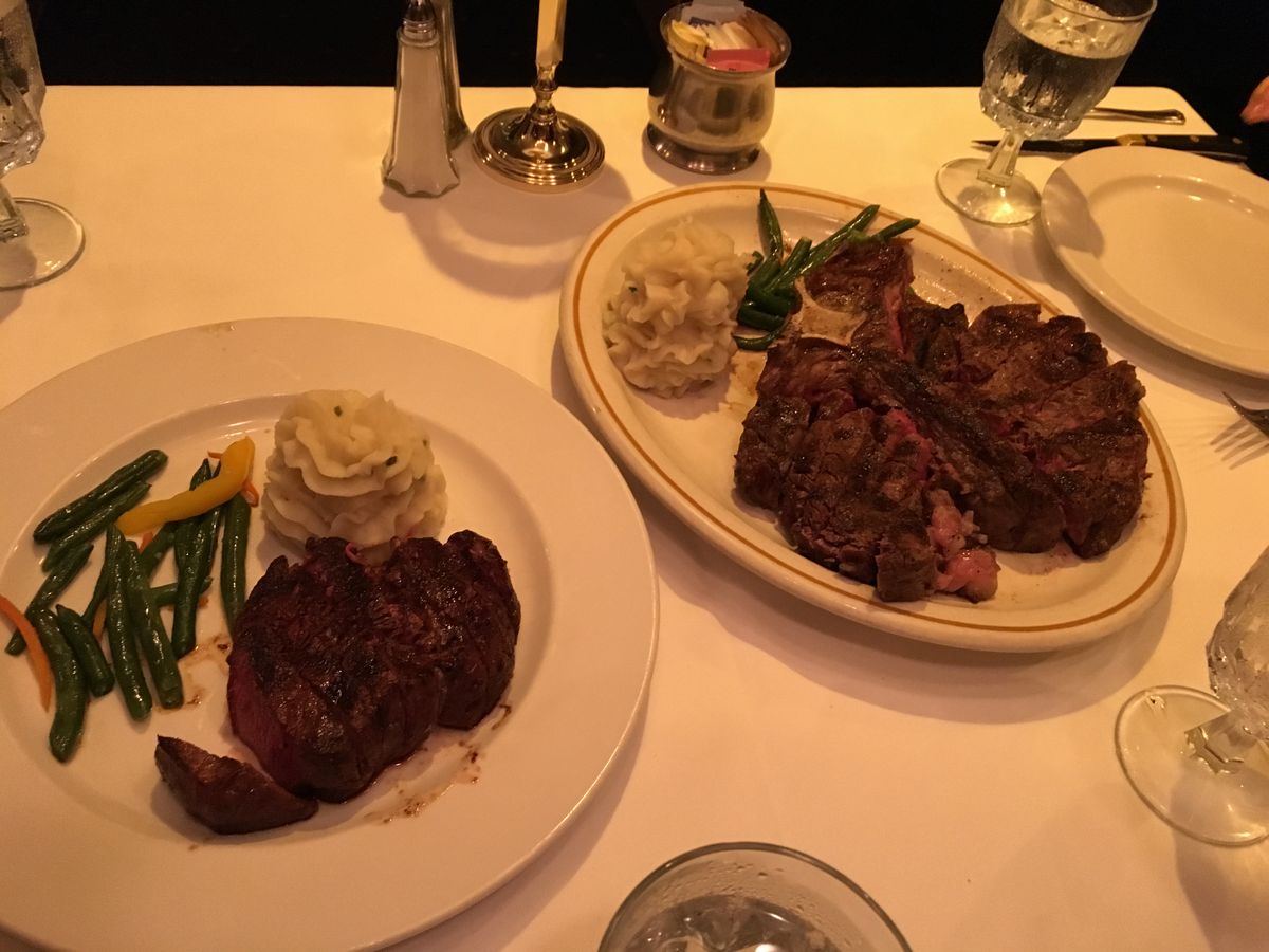 フィレはめちゃくちゃ柔らかくジューシーでしたが、サーロイン部分が少し筋が多く残念でした。付け合せにマッシュポテトを頼みましたが女性陣には大好評でした。さすがに出費は今回の旅行中最高額でしたが私の還暦祝いという名目で贅沢をしましたがそれに見合う満足のいく至福の時を過ごせました。
