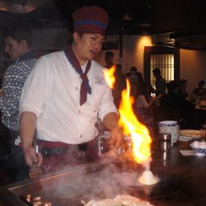 ハワイに来るたびに広告で良くみかけるのでぜひ行ってみたいと思っていたので今度は前もって予約して行きました。予約は必要ないだろうと思っていたのですが、仲間がいるので当日ばたばたするのがいやなので予約しました。結果は、大正解。遅めの午後8:30に予約したにも関わらず入り口人が並んでましたし、中はパーティ会場のように座席がいっぱいでした。あちこちのテーブルで歓声があがり、なんとなく気分が高まってきました。料金はステーキコースで$20~30でリーズナブルだと思いました。フィリピン人のシェフが包丁・炎のパフォーマンスとジョークでなかなか楽しく食事を開始することができました。言葉の関係でしょうか、日本人のテーブルとアメリカ人のテーブルに分かれているようでした。まあ、味は少々大味ですが、気分もいいのでパクパクと食べてしまいました。あとから考えればハワイではかなり美味い部類かもしれません。もちろん、残ったものは、覚えたての「ボックス、プリーズ!」と言ってテークアウトしてホテルで夜食にしました。東京でもこの店があればいいなと思ったのですが、紅花はかなり高価ですからね。残念です。ハワイに来たらまた行きたいと思いました。
