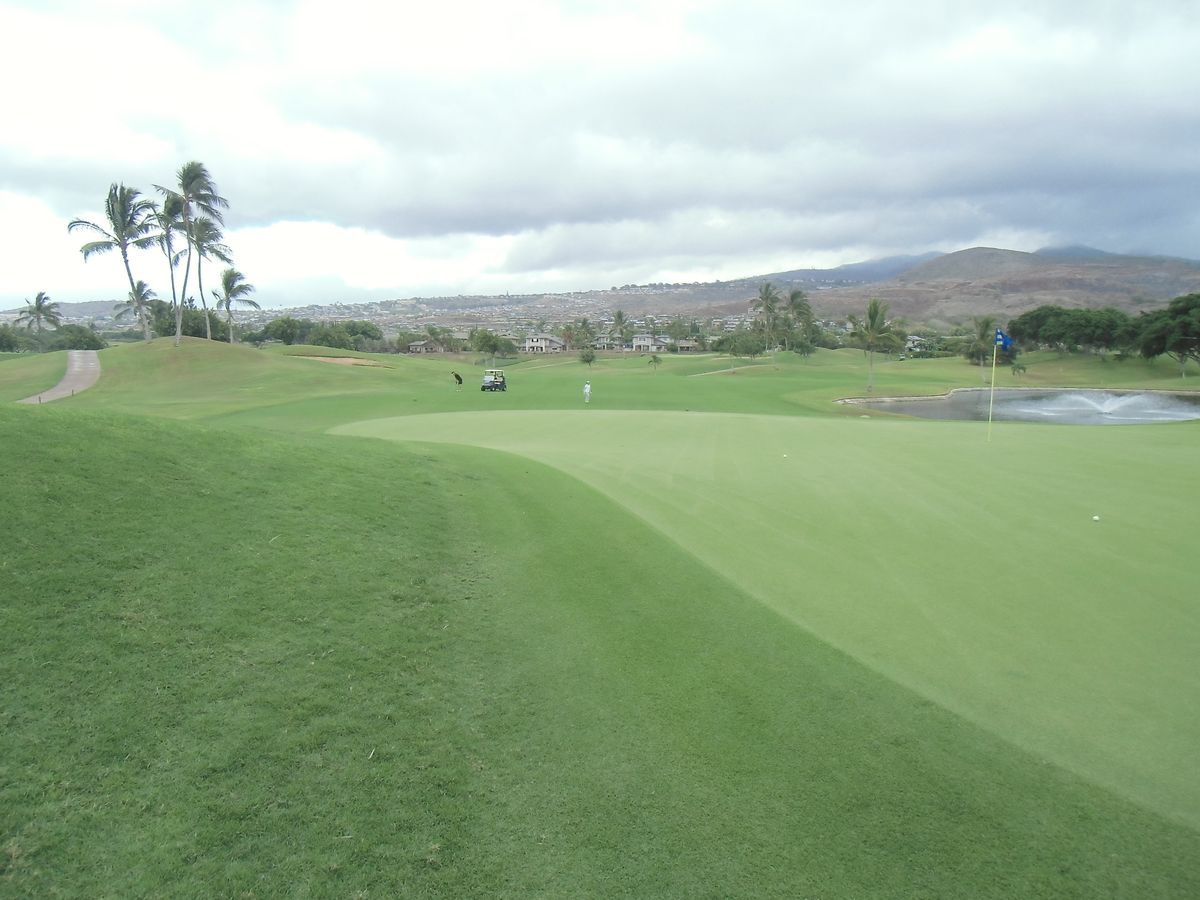 1ホールのティグラウンドに立つと、広々としたハワイらしい景色が眼に飛び込んできます。池もパームツリーもハワイらしさを醸し出しています。18ホール終了後は空は広いな、地球は丸いなと実感できます。