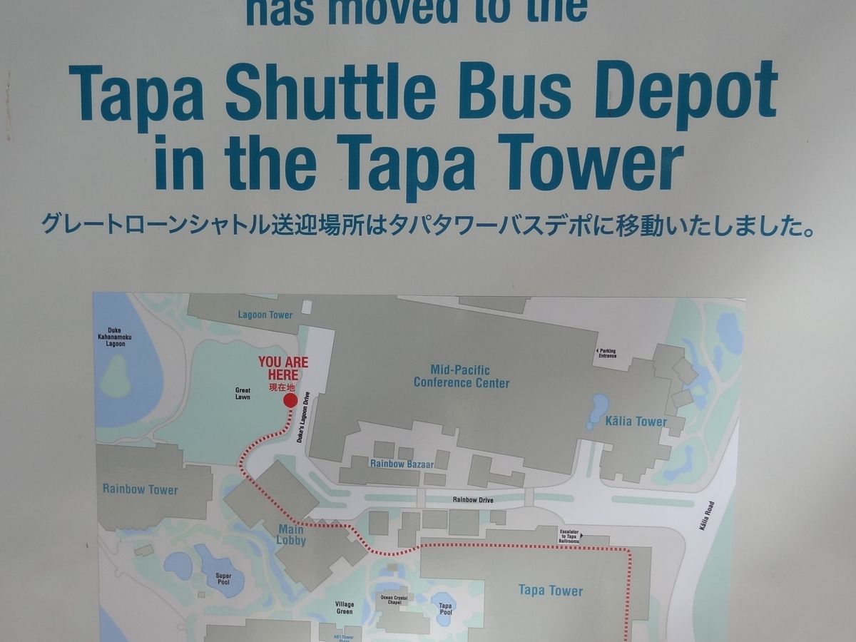 ヒルトンビレッジ内の送迎場所が、グレートローンからグランドアイランダー1階に変更になったようでした。