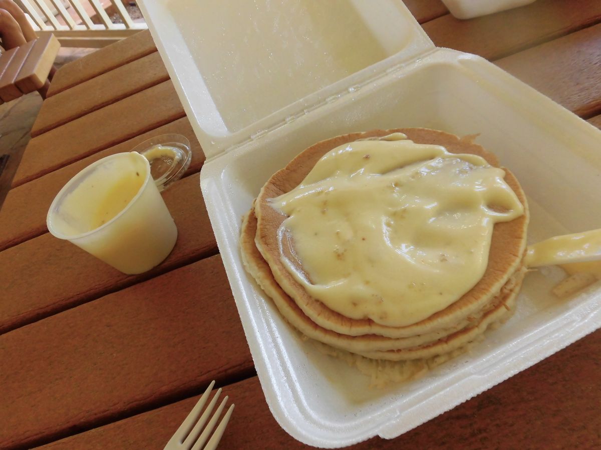 その後テラスでランチタイム。シュリンプ&パンケーキ、そして食事後に食べるのにと買ってきてくれたパイナップルの果肉入りアイス。