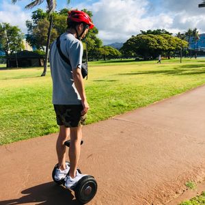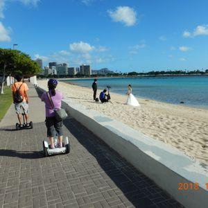 練習場所からアラモアナビーチパークまでの道中の多少難易度が高めのところを通過する際は、多少慣れるまで時間がかかった妻をインストラクターが誘導しながら進んでいって下さったので、安心して走ることが出来ました。途中の休憩時にはナインボットMINIにも試乗をさせて頂けたので、違う楽しさが味わえました。また、予め渡したスマホで写真や動画を沢山撮って頂けたので、記念にもなりました。道中、各スポットの説明だけでなく、パンケーキのお勧めのお店も教えて頂き、帰りにはホテルではなくお店まで送って頂いてとても助かりました。