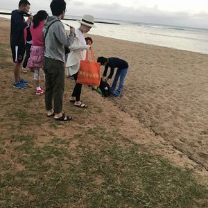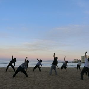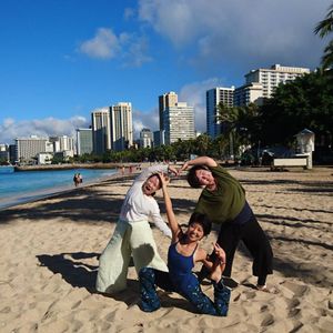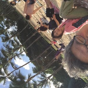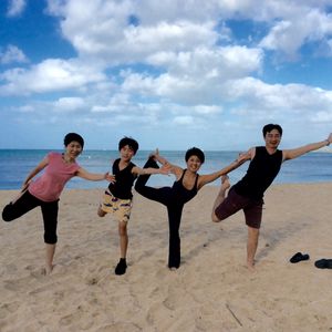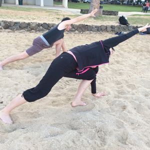 午後13時過ぎの便で日本に帰る日だったのですが、朝7時20分集合という早い時間のレッスンだったので参加出来ました。集合場所もホノルル動物園のゲート前でわかりやすかったです。時間になるとだんだんと参加者が集まって来ました。この日は30人くらいだったでしょうか。インストラクターの先生は、はっきりとキビキビした方でわかりやすくリードしてくれました。身体の硬い夫も「パパ、そこもう少し頑張って〜。」などと軽快な声かけをしてくれました。素足で、そして手で砂を触る感触、ふっと見上げると青い空。自然に瞑想的な気持ちになりました。
