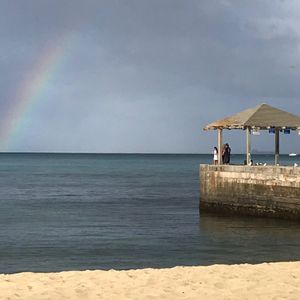 その日は少し雨が降りそうな日でしたが、小雨程度なら中止しないと説明がありました。途中、小雨が降りましたがほとんど気にすることとなくヨガを続けることができ、その雨のおかげで海に虹がかかって、逆に雨が降って良かったとさえ思いました。