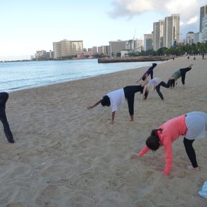 初めてハワイでビーチヨガを体験しました。当日の朝は動物園前に集合。散歩がてらにホテルから歩いて向かいました。6:45集合とありましたが、インストラクターの方が来たのが6:50をまわったところ。他の皆さんも少し不安げな表情をされてました^^; そこから砂浜に移動してビーチでヨガをしますが、晴れていたこともあり、青い空・青い海・波音を聞きながらの最高のシチュエーションでとっても気持ちよかったです!バスタオルは持参しますが、大部分は直接砂の上で行うので、服は上下とも砂まみれになります。笑 汚れてもいい服での参加と、参加後のシャワーは必須です。ヨガ自体は少しハード目ですが、たっぷり1時間超あり、リフレッシュできるのでお勧めです。