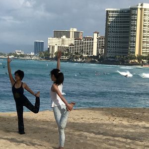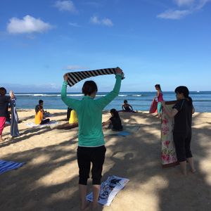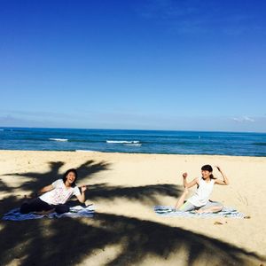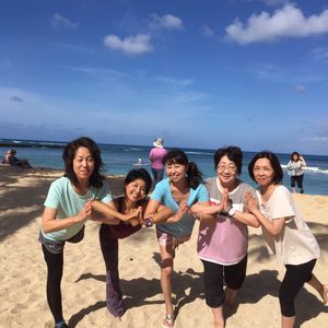 日本でヨガを始めた母に、ハワイのビーチでヨガ体験をしてもらおうと参加しました。当日は晴れて朝の7時は涼しく、波の音や鳥の鳴き声を聞きながらのヨガは最高でした。母はあまり難しいポーズは出来ないので心配でしたが、周りの方も初心者が多かったし、あまり難しいポーズは無く、先生もフレンドリーで説明も上手くて、母はハワイのビーチでヨガした事を喜んでくれたし、自信につながったようでした。またハワイに来た際は参加したいです。