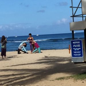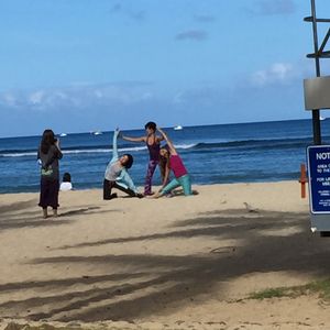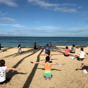今回初めてヨガを体験しました。参加した際の先生(女性の日本人)の指示が的確でわかり易かったので、綺麗な海の景色と風を体感しながら気持ちよく、ヨガをすることが出来ました。ヨガのポーズはバランスが難しいものが多かったのですが、砂浜で裸足でするので、砂がちょうど足の形に沈み、それが返ってバランスを支えてくれてやり易くしてくれました。また先生の指示で、難しいポースの時は膝を曲げるなどアドバイスをして下さったので、とても助かりました。暖かい日差しと涼しい風を浴びながら、十分にハワイを満喫できるいい経験が出来ました。次回ハワイに行った際も、是非参加したいと思います。