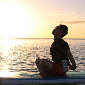 ボードの上で必死にチャレンジしている中で、インストラクターより陽が沈む頃、太陽に向かってしばらく祈りのポーズ。