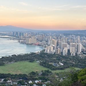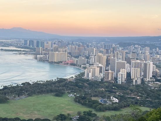早朝5時集合でしたが是非行くべきツアーです!登山口で開門を待ち真っ暗の中トンネルを抜け、車を降りてトイレを済ませて登り始めます。日の出前の薄っすらとしらむ中、小鳥のさえずりを聞きながら結構きつい坂を登り始めました。途中、2〜3回休憩し水分補給をしました。山頂からの日の出とワイキキの景色はとても美しく頑張って登った甲斐がありました!下山後のKCCファーマーズマーケットも楽しかったです。
