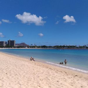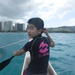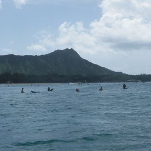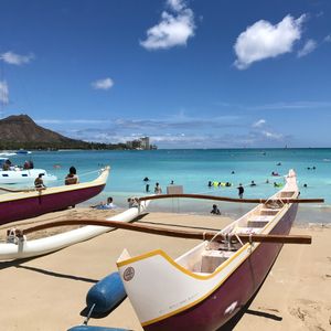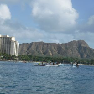 子供たちは漕ぎませんでしたが船に座り、ワイキキの青い海に自分たちでこいで沖へでて、船長さんの合図にあわせて漕いだり、休んだりしていい波が来るのを待って、いいなみがきたら思い切り漕いで陸に向かって漕ぐとその後全く漕がなくてもすごい早さで陸に向かってスーッと進んで1度目はすごく楽しかったです。子供たちもすごく喜んでもう一回やりたいといって再度沖へ、