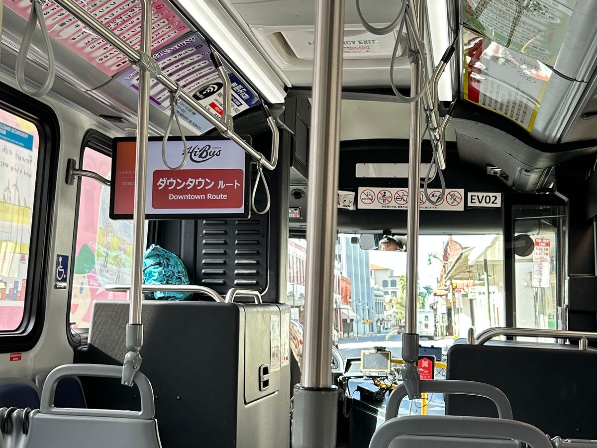 お客様がご乗車されたのは車体にイラストの入ったバスタイプの車両ですね。こちらはオアフ島の大気汚染を軽減することが目的として作られた100%電動のバスとなります。