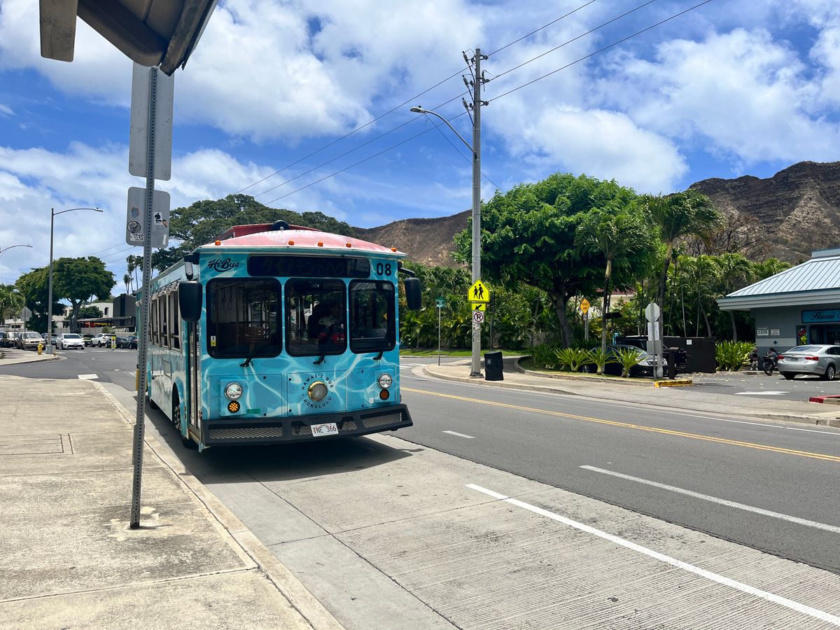 利用日が7月8日でワイキキの中心部が交通規制をされていてKCCファーマーズマーケットに行くためのトロリーの為予約していましたが、停留所が変更になった事を知らずに結局1時間以上まってKCCは諦めました。利用日をみて、受け取りカウンターで何か一言かお知らせが欲しかったです。受け取りに行ったシェラトン近くのカウンターの方もなんか愛想が無くてがっかりでした。日本のサービスと思って利用すると…って感じです。