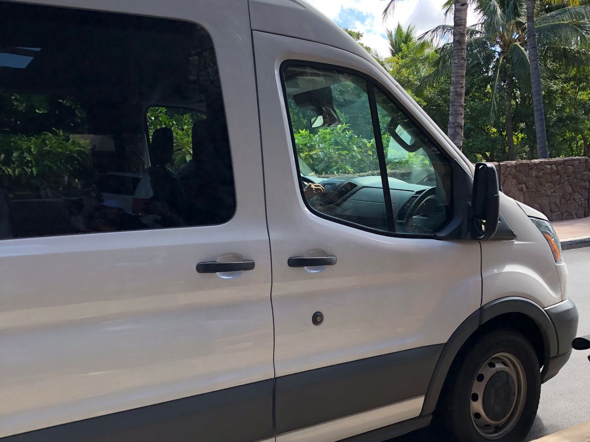 予定表では他のホテルの方たちをピックしてアウラニに向かうと書いてありましたが、最初の段階でバンはいっぱい。定員になったからなのか、他のホテルの方もこの集合場所に来たのかはわかりませんが、他のホテルに寄ること無くアウラニに向かいました。