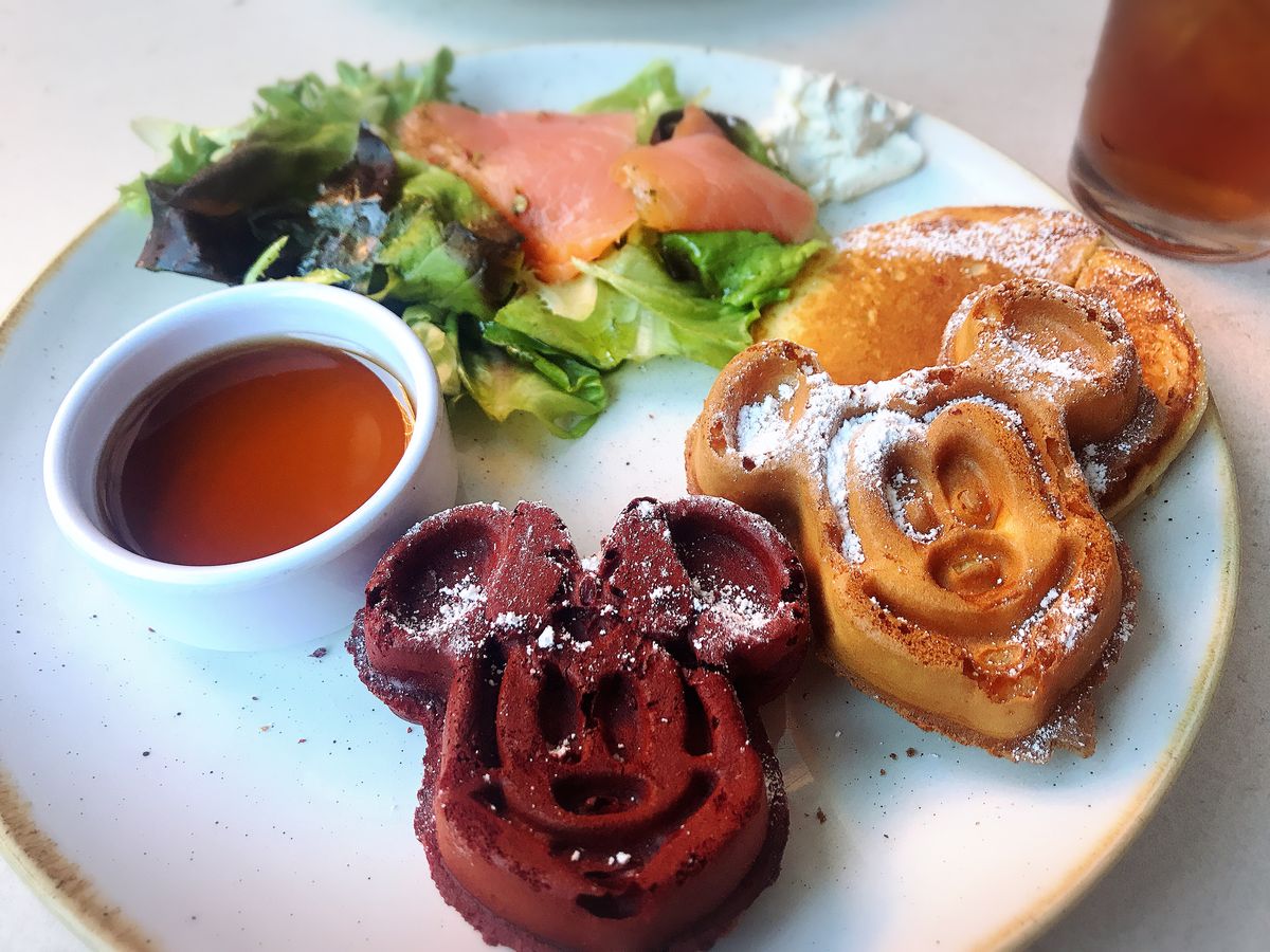お待ちかねのブレックファストへ。まずはミッキーと写真。ミッキーはこの後レストラン内には現れないのでここでしか写真撮れません。体験談などではポーズのリクエストも可能とのことでしたが、子供だけと全員の2パターンしか撮れず。