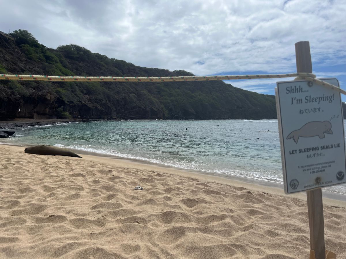 日の出前の5時40分集合はさすがに早いが、それでも現地では4組〜5組めの入場グループでした。有料OPでパラソル・チェアセットをレンタルしましたが、日差しが強いのでぜひお勧めします。午前中はヒトも比較的少なく楽しめます。10時頃に私たちのベース基地から10mくらいの場所に突然にモンクシールが砂浜にあがってきて休憩するという超ラッキーサプライズに出会えました。一緒の孫がハワイに来る前から会いたいと話していたので、偶然にも叶えてあげられてよかったです。モンクシールには15m以上距離を取らなければいけない法律があるので、我々のベース基地は速攻移動させられたのもいい思い出です。