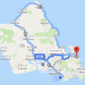 Kalakaua Ave.Diamond Head Rd.Kahala Ave.を経由して72号線でオアフ島の東海岸を通ってカイルアへ。カイルアでは自転車でラニカイビーチを往復して再びレンタカーで830号線、83号線、Kamehameha Hwy.を北上してノースショアのカフクでガーリックシュリンプを堪能。引き続きKamehameha Hwy.でオアフ島の東半分の海岸線を制覇し、ハレイワのシェイブアイスを堪能して、99号線、H2を突っ切って戻りました。