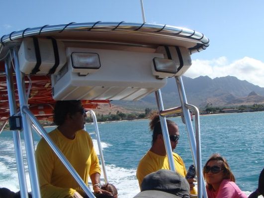 前回は別のツアーに申し込んだのですが、イルカを追いかけて必死に泳いでいるだけで、ほとんど姿をみられませんでした。ドルフィンユーの場合は、キャプテンがイルカの動きを予測してポイントに落としてくれるので、追いかけ回すことなくイルカの群れを見ることが出来ました。また、ライフベストも自分で空気の量を調整できるため、泳ぎに自信のある人は潜ったりすることも出来るので、とても楽しめました。泳ぎの得意な8歳の娘が子供用のベストでなく、大人用のものを使いたいと泣いていたところ、シャンティが優しく慰めてくれ、大人用のベストに替えてくれました。3回のトライすべてでたくさんのイルカを見ることが出来て大満足でした。ウミガメのポイントでもゆっくりとシュノーケルをさせてくれたので、4~5匹のウミガメとずっと泳いでいられました。このツアーは、本当にゲストを楽しませようという心遣いに溢れており、感激しました。前回のイルカツアーや、別のツアーとは全く違い、ゲストのことを第一に考えてくれていることを常に感じていました。ハンバーガーも美味しかったし、フラダンスもやってみると意外と楽しかったです。次回もイルカに遭いたくなったらこのツアーで行きます。シャンティ・カイナ・イラ・スティーブ、みんなありがとうね!!