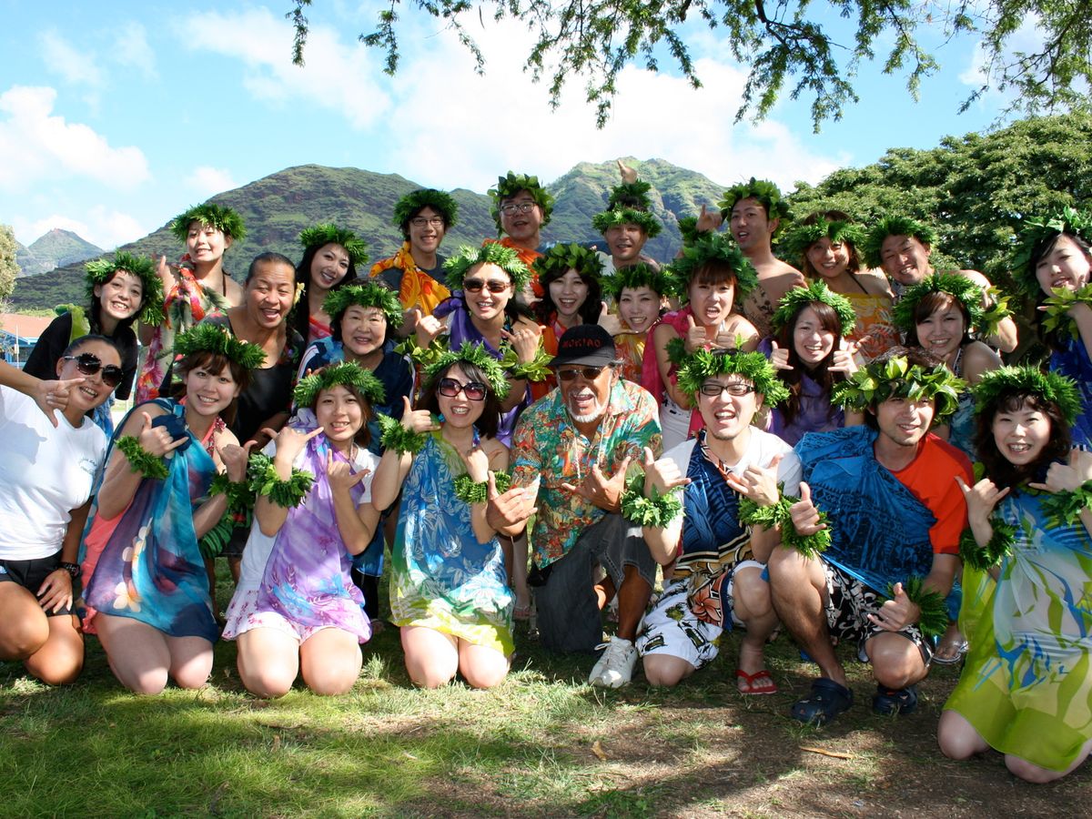 現地に着くと、先にフラダンスをやるという事で傍の原っぱにて衣装を借りて皆で踊りました。あっという間でしたが説明もわかりやすく楽しかったです。