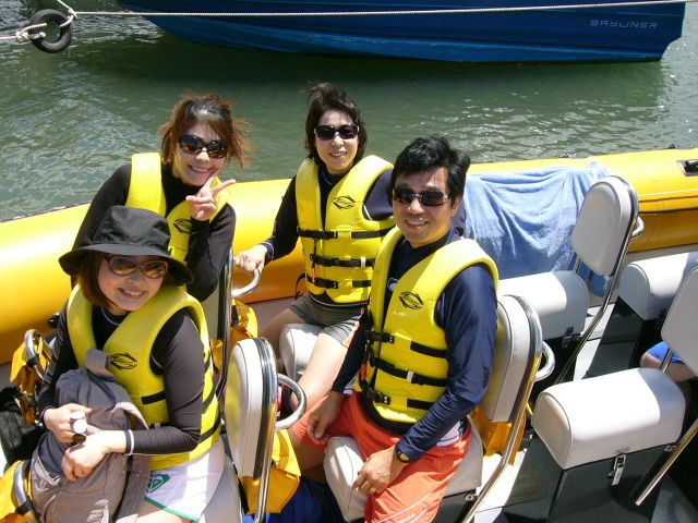 これで沖合いまで大丈夫?って感じですが、乗ったらスリルも満点で最高でした。若い女の子たちと一緒でしたのでハイテンションでした。一緒に潜ってイルカを見つけてくれるスタッフの女性はアメリカ人でへザーさんといいますが日本に留学して日本語を学んでいたので言葉は安心ですよ。