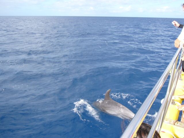 港からパワーボートでイルカのいる海域へ一直線。藍色の海、そして透明な青の海、そこにはたくさんのイルカの群れが見えました。陽気な船長の合図でクルーと一緒に海に入ると手の届くところにイルカたちがいて一緒に泳ぎたくても、なかなか追いつくことができません。母子が寄り添って泳いでいたりジャンプをしたり、すごく”カワイイ”イルカたち。