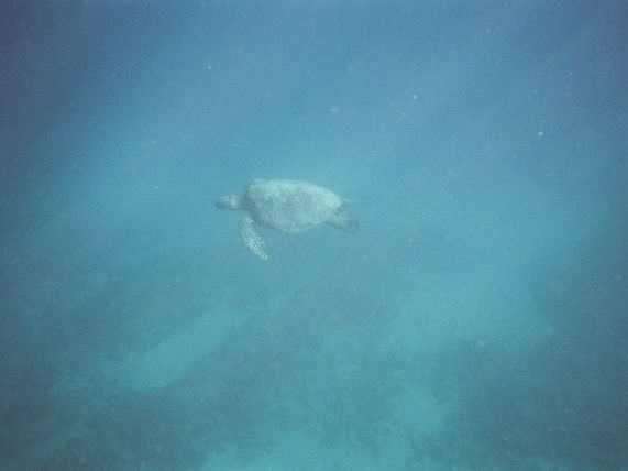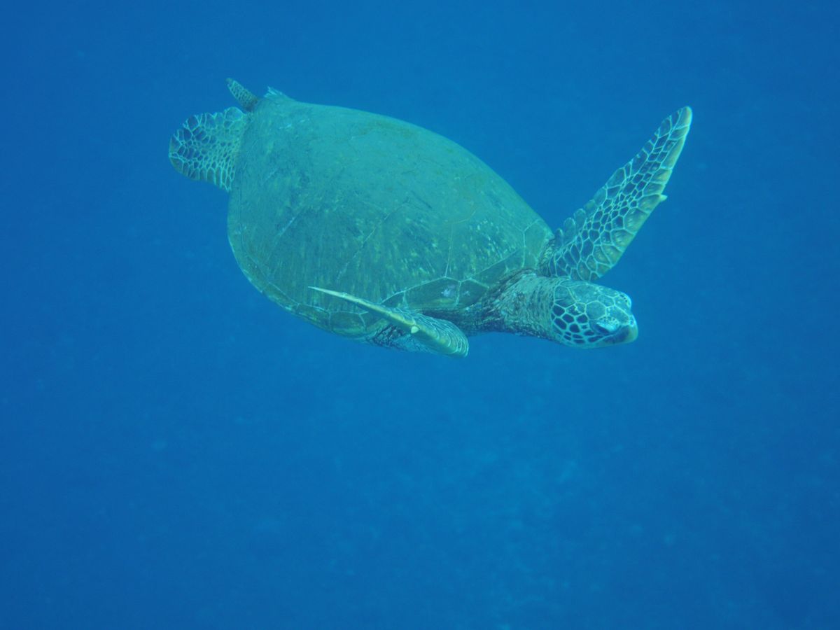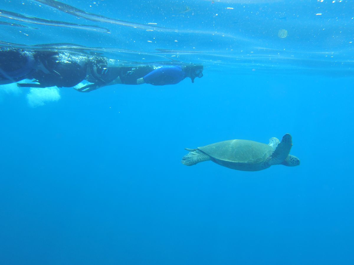 イルカポイントで2度のダイブの後は、ウミガメポイントへ移動。こちらでは泳ぎに自信があればライフジャケットを外せて、ずーっと亀先生を追いかけて泳ぎます。あんまり近いので思わず手を伸ばしそうになります。ウミガメは天使の羽そっくりのひれをパター、パターと動かして飛ぶように泳ぎます。ホントにかわいい!