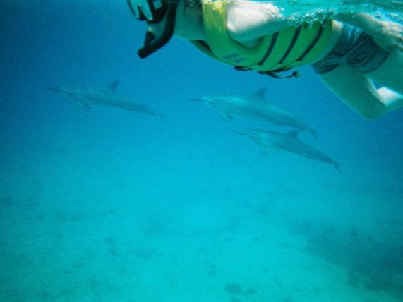 そこからボートに乗ってイルカのいるスポットに到着。早速海へ入ってイルカと一緒に泳ぐ。