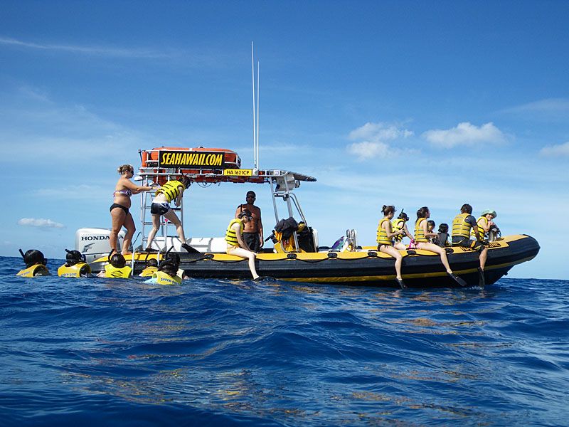 シャトルバスが各ホテルに迎えに来てくれて、乗車1時間弱で西海岸の乗船場に到着。出航の準備ができ次第、ライフジャケットとシュノーケルセットが渡されて乗船。レディーファーストで女性は座席に座り、男性陣は基本的にボートの縁にバナナボートのように座ります。