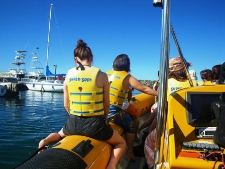 イルカを見るために乗り込むのは、大型のゴムボートの様なものです。風をきって跳ねるように進むボートの上で、本当に野生のイルカと泳げるのかしら、と期待と不安は高まります。イルカを発見したら教えてね、と船長は言いますが、全く姿は見えません。