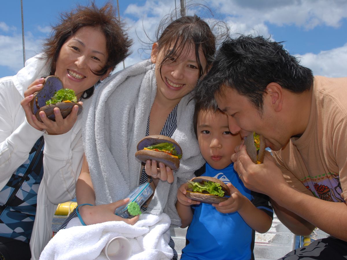 私たちはダイビングをしたり、イルカとも一緒に泳いだ経験がありましたが、イルカに会うのは何度経験しても楽しめるものでした!!船長さんが作ってくれた、チーズバーガーもとてもおいしかったです。