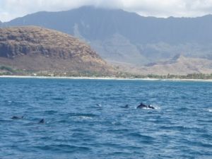 当日、お天気は曇りで少し肌寒かったのですがイルカちゃんにはバッチリ会うことが出来ました。イルカと一緒に泳いで・・・8歳になる下の娘なんかはシュノーケルをくわえたまんま「スゴーイ!イルカと泳いでる~!!」の連発。イルカに夢中の我が家の娘に合せてくれたのか、イルカとの時間をたくさん取ってもらえました。本当に楽しかったし、癒される体験でした。その後のハワイ滞在中も「イルカ行きたい!」と毎日言われ、日本に帰ってからも「イルカが一番楽しかった!」と、17歳の上の娘も言っています。次回のハワイも是非参加させていただきます!!サーファーの主人はマカハに置き去りにして・・・。