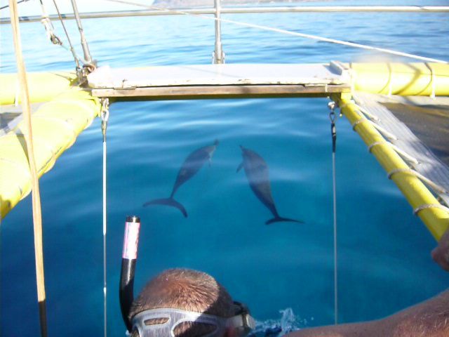 ワイキキから45分でコナマリーナに到着、テレビで見るようなヨットハーバーまるで自分たちがオーナーであるかのようなリッチな気分で船に乗り込み、イケメン風のお兄さんとダンディなボーン船長とキュートでかわいいハワイ娘の3人が案内してくれます。コーヒー・紅茶・水に缶ジュースは飲み放題です。ツアーの案内にイルカとの遭遇は確約ではありませんと書いてあったので、会えなくても仕方ないかぁと思っていたら、10分もしないうちに「イルカ」という声で船首に出てみるとイルカの群れが泳いでいました、親子イルカまでいます、親子仲良く離れずに泳いでいます、船はつかず離れずで進んでいきます、イルカは夜行性で昼間は寝ながら泳いでいると説明を聞きながら見ていると、空中に飛び3回転スピン・2回転スピンをしてくれました、カメラしかもっていなかったので、今から飛ぶぞと言ってくれない為、シャターチャンスは見逃しましたが、ビデオを持っていくといいですよ。さあいよいよシュノーケルに挑戦、説明を受けいざ海へ、息の吸う吐くがうまくいかず、げぼげぼ、こつをつかみ水深6mの海の中をのぞいてみる、海がめのいそうなスポットへハワイ娘が案内してくれます、海がめが泳いでいる、しかも5頭もいるではないですか、そして船から「イルカがきたよ」との合図に海の中をのぞく、すぐ横にイルカが泳いでいる、「ピー」というイルカの声が聞こえる、娘と二人顔を出して、見たの合図、娘はもぐってみたいとハワイ娘におねだり、シュノーケルをはずし、足ひれをはずし空気をぬいて、素もぐり、うまく沈まない、2.3回トライ少し深くもぐって耳が痛いと断念、ハワイ娘は、素もぐりでかなり深く沈んで手本を見せてくれていました。なぜかこの日はシュノーケルをする人が私と娘ともう1人シアトルから来た娘さんと3人だったので、ゆったりと楽しむことができました。他の人たちは船から、私達をウォチングしていました。その後は船のなか、チキン.パン.サラダ.フルーツ.ヨーグルト.マフインの朝食、とってもおいしかったです。次回も絶対シュノーケルをしたいと心に決めた日でした。Alan1ちゃん本当にありがとうございました。とっても有意義に過ごすことができました。