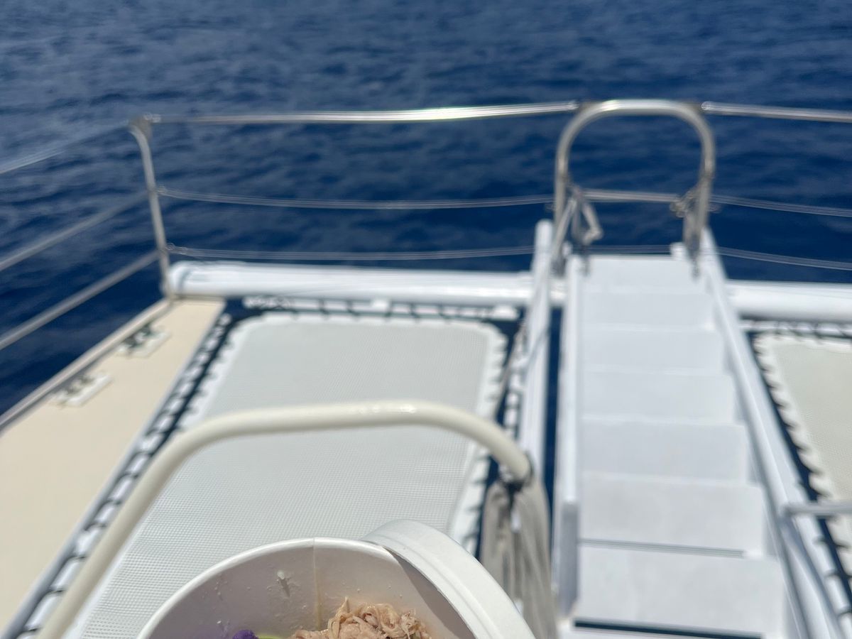 イルカウォッチング、シュノーケリングを楽しんだ後、埠頭に戻る間に遅めのランチ(午後3時くらい)です。天気が良くて、景色もすばらしく、最高のランチタイムでした。船上で日差しを遮るところは少ないので、帽子、サングラス、日焼け止めは必須です。濡れたままだと寒いので、バスタオルや水着の上に羽織るものがあった方がいいかもしれません。