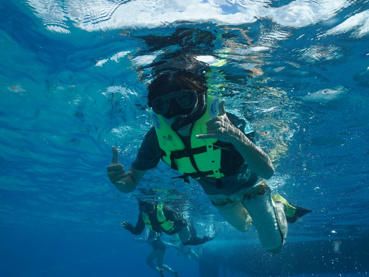 イルカやウミガメに触れてしまいそうになるくらい近かったです。私はそんなに泳ぎがとても得意な方ではありませんが泳ぎやすく、ライフジャケットを外して潜ることもできました。とっても近い場所で見ることができ嬉しいです。また、イルカやウミガメの住んでいる実際の姿を見て、海を大事にしたいと思いました。