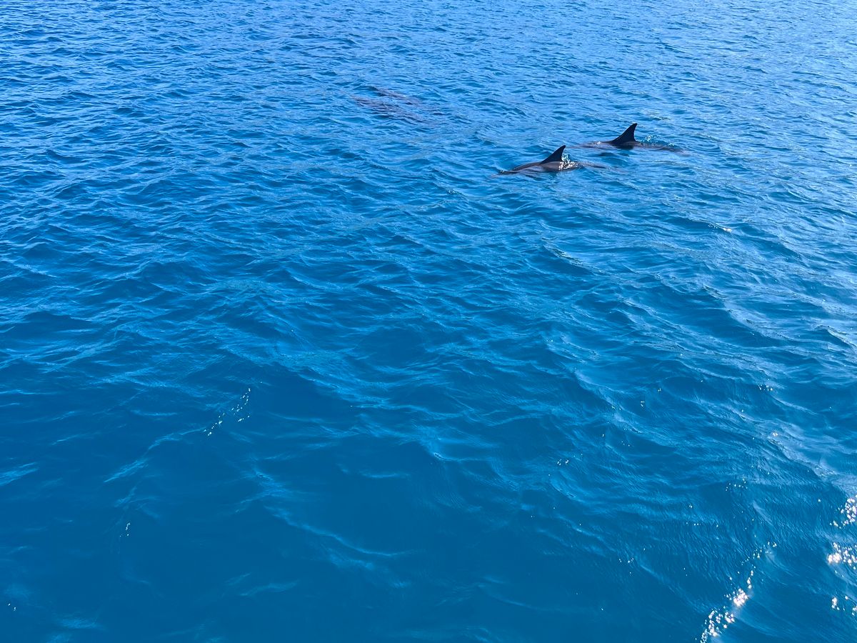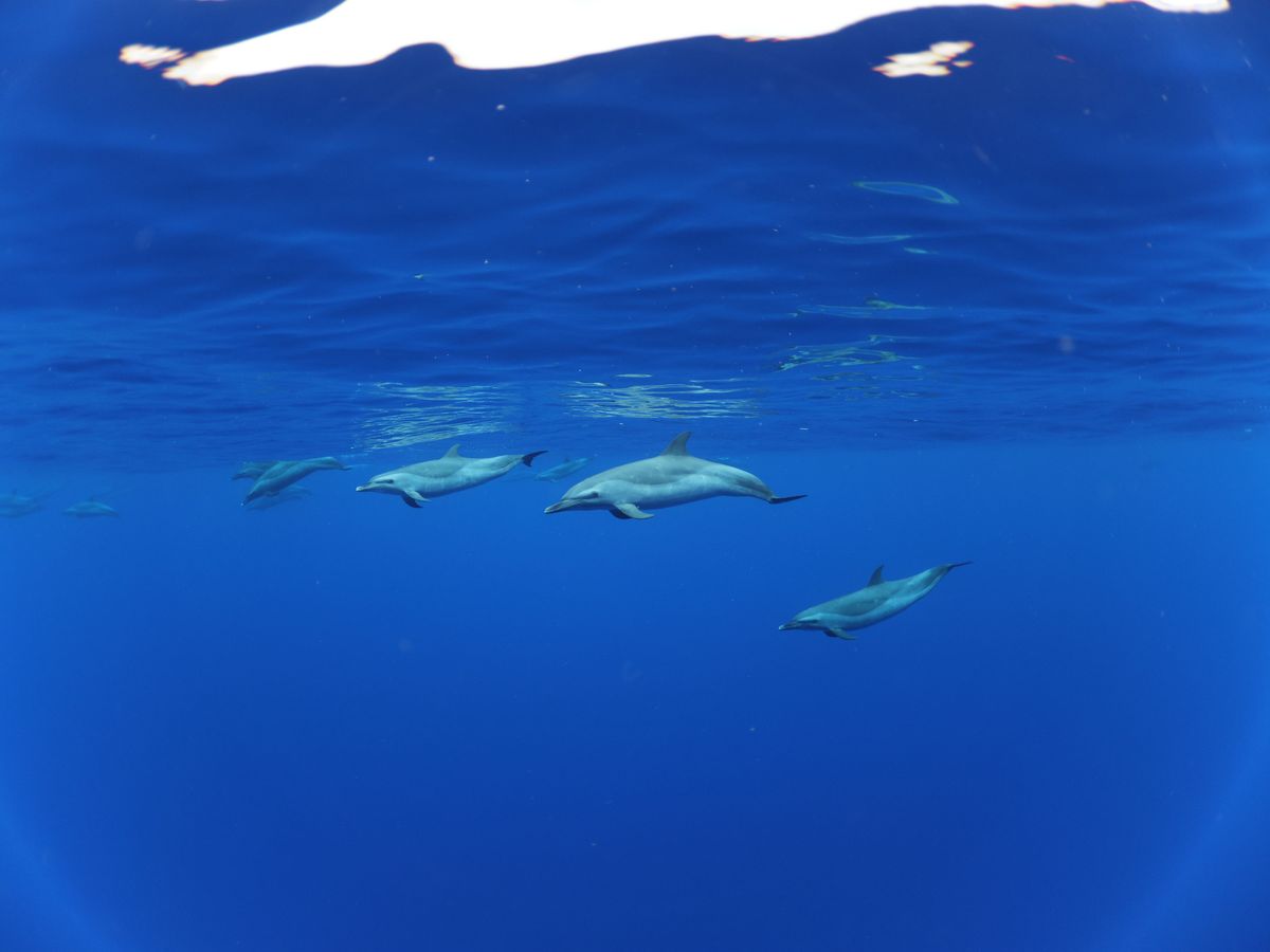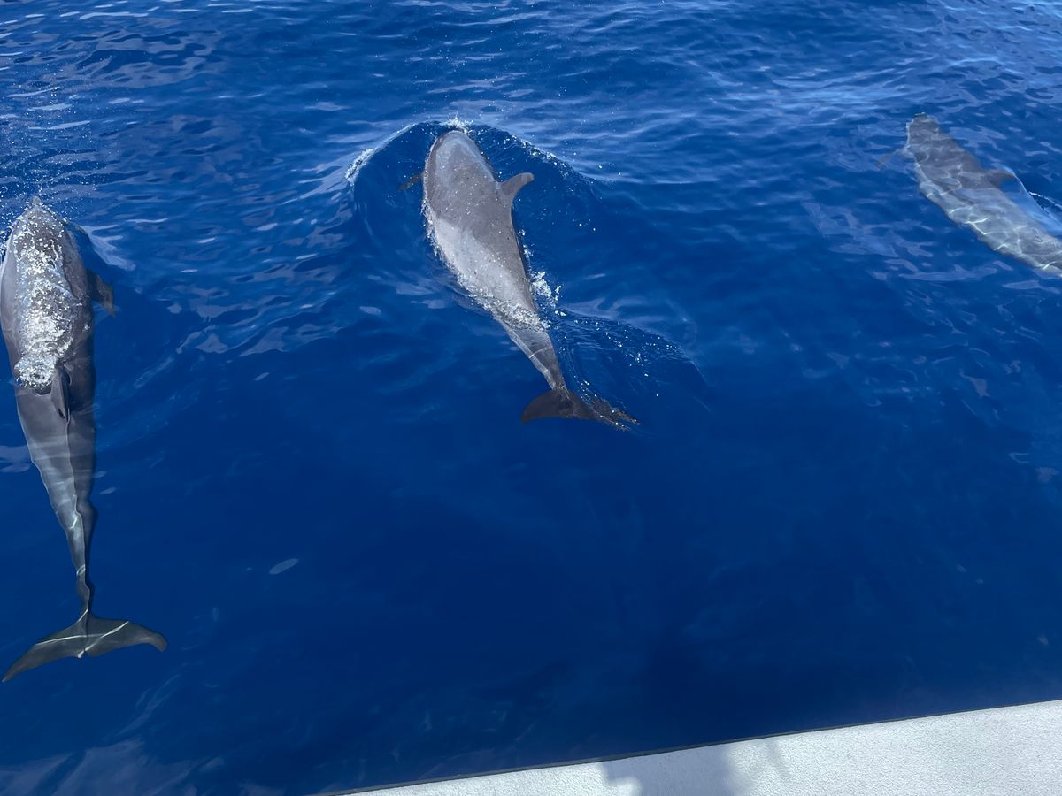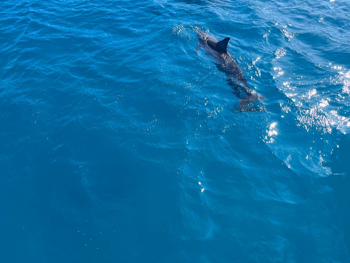 イルカを探しに行ったのですが、沢山のコビレゴンドウの群れに遭遇しました。会えるのはレアだということで、船上は大興奮でした!日本人の明るいガイドで会社代表のジュリさんがいましたので、英語が話せない方も安心して参加できると思います。広い船内にゲスト20人くらいでしょうか。ゆったりとしていて快適に過ごせました♪(帰港したら別の会社さんの船が出発するところでしたが、人が乗るわ乗るわ。。大混雑でしたので、コチラのツアーで良かったと思いました)一点、カメラマンが沢山良い写真を撮ってくれたのは良いのですが、そのためなのか、ゲストを待たずに1人でコビレゴンドウに接近してしまい、水面を泳いでいた彼らは水中のなかへ。。私たちゲストが到着した頃には水面に潜っていく最中でした。。もうちょっとカメラマンは待つべきだったと思います。その後移動し、また水面を泳いでいた彼らと2本目を泳ぎましたが、私が行った時はもう水中深く潜った後だったのであまり見ることができませんでした。
