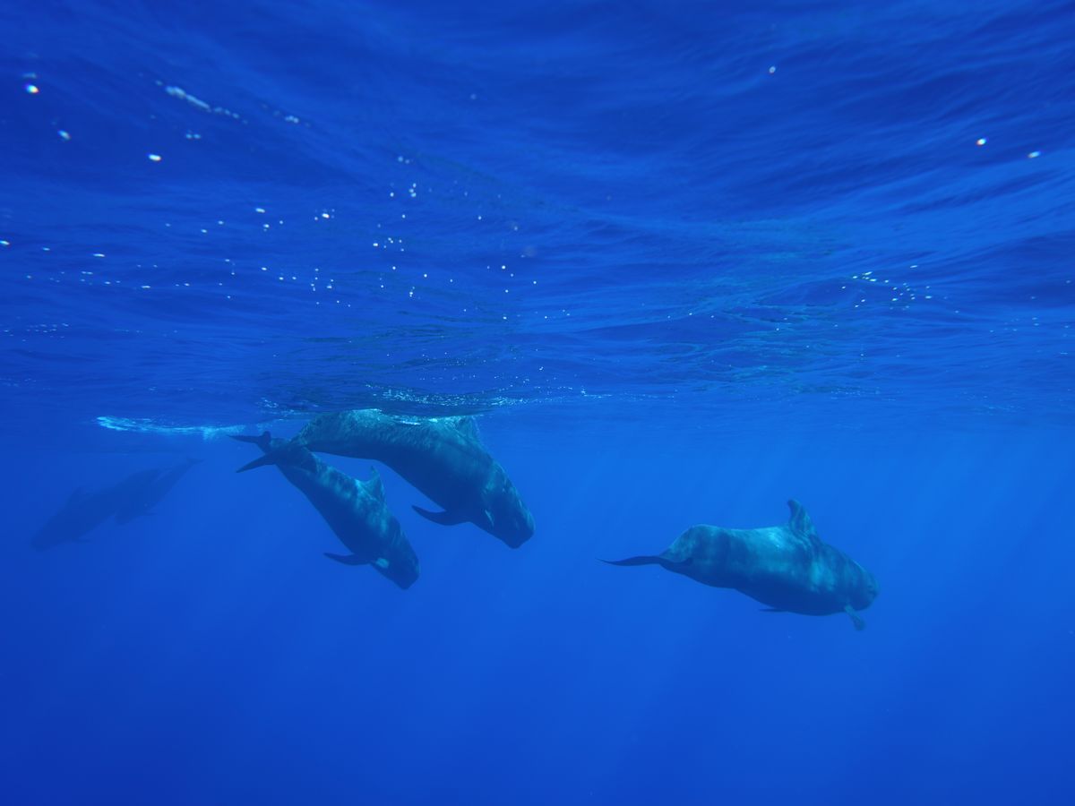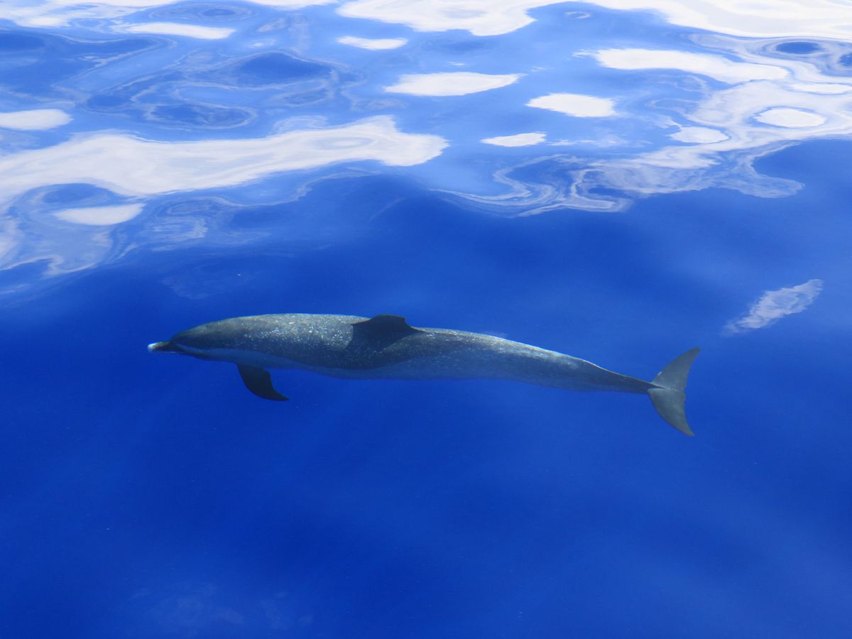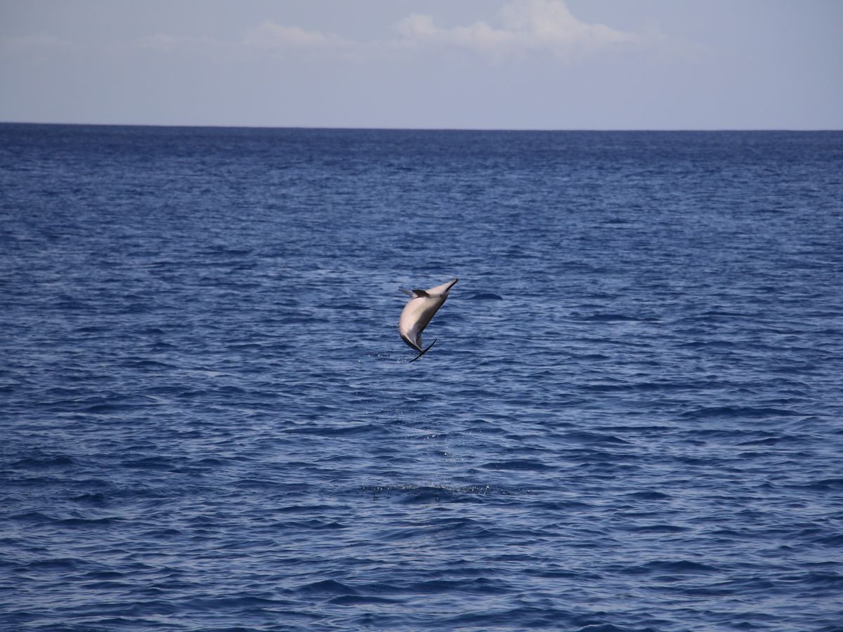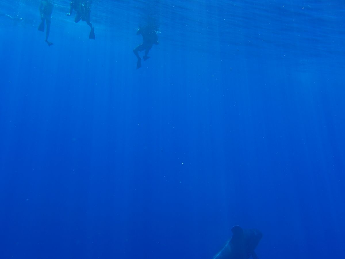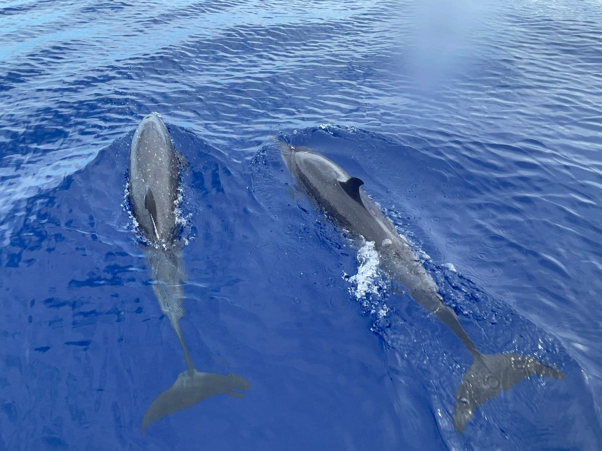 イルカを探しに行ったのですが、沢山のコビレゴンドウの群れに遭遇しました。会えるのはレアだということで、船上は大興奮でした!日本人の明るいガイドで会社代表のジュリさんがいましたので、英語が話せない方も安心して参加できると思います。広い船内にゲスト20人くらいでしょうか。ゆったりとしていて快適に過ごせました♪(帰港したら別の会社さんの船が出発するところでしたが、人が乗るわ乗るわ。。大混雑でしたので、コチラのツアーで良かったと思いました)一点、カメラマンが沢山良い写真を撮ってくれたのは良いのですが、そのためなのか、ゲストを待たずに1人でコビレゴンドウに接近してしまい、水面を泳いでいた彼らは水中のなかへ。。私たちゲストが到着した頃には水面に潜っていく最中でした。。もうちょっとカメラマンは待つべきだったと思います。その後移動し、また水面を泳いでいた彼らと2本目を泳ぎましたが、私が行った時はもう水中深く潜った後だったのであまり見ることができませんでした。