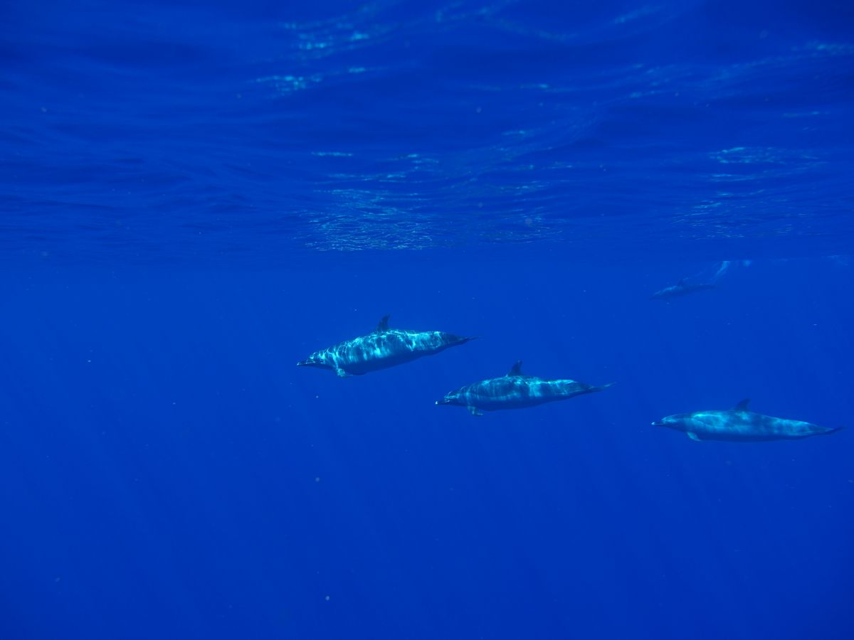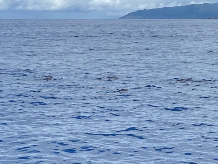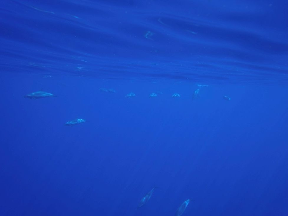 順調にイルカが見つかり、3本も海に入りました。ただ、よくイルカがいるところを見て、素早く船から海に飛び込まないと、近くで見ることはできないようで、私は、下の方を素早く泳いでいくイルカたちを見ることしかできませんでした。ちゃんとすぐ近くで見えて感激したと言っていた方々、多かったので、自分の要領の悪さがとても残念でした。