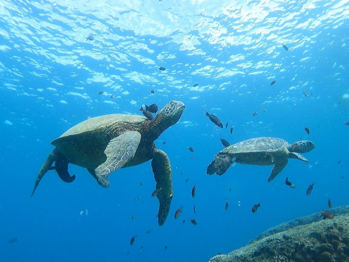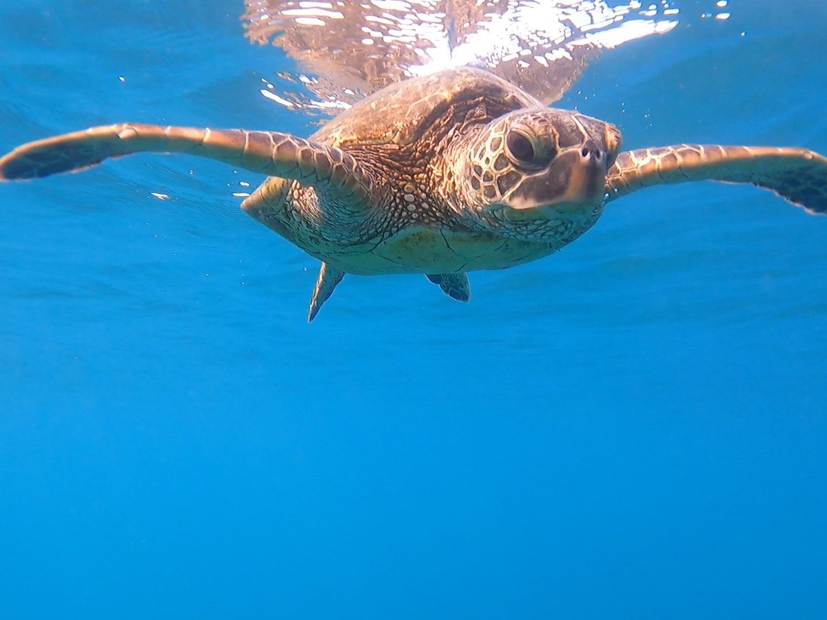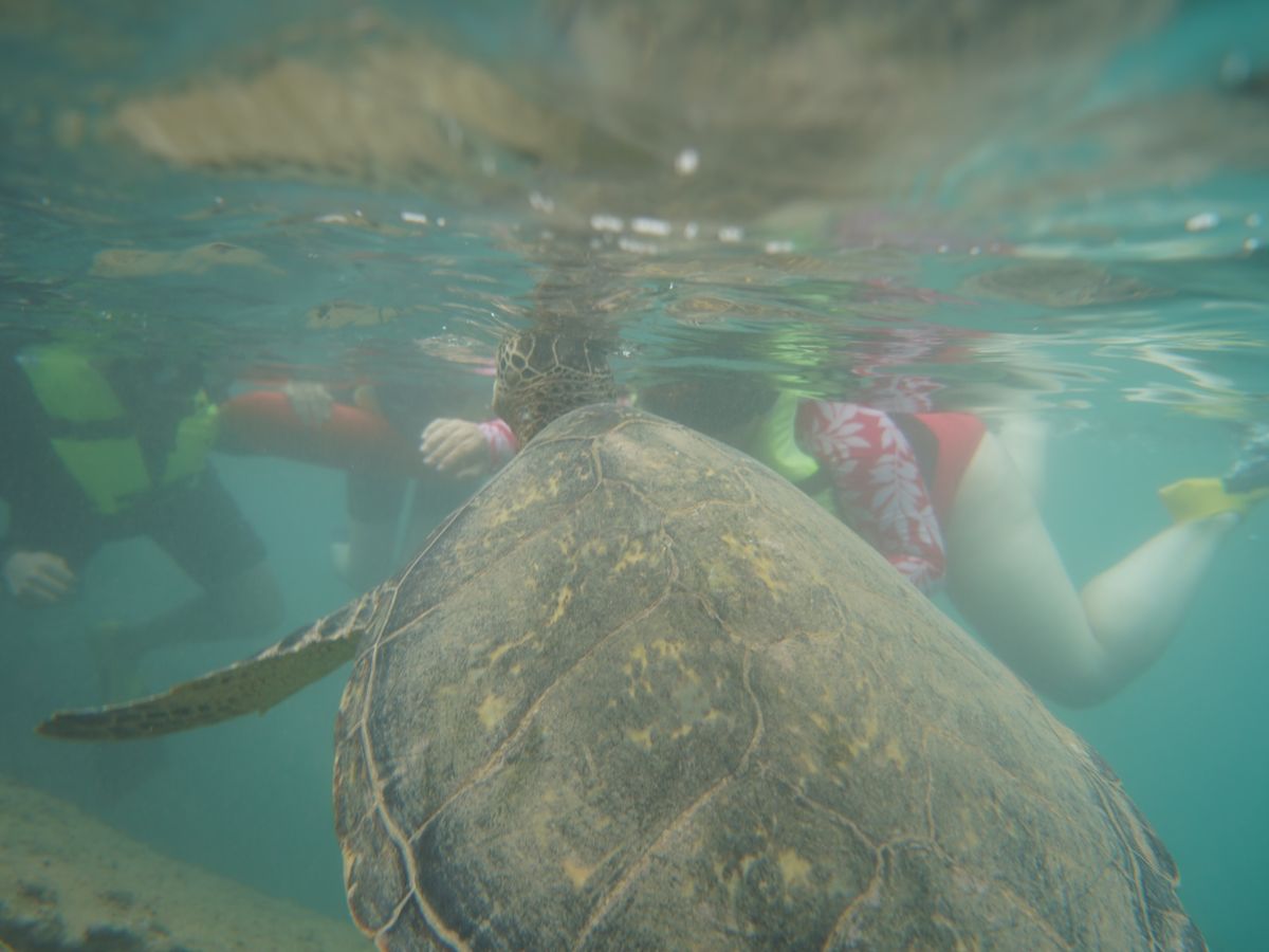 次はいよいよシュノーケリングによるウミガメウォッチング。私は初めてで不安でしたが、ライフジャケットを付けボートのすぐそばで、ガイドさんの指導の下なので安心でした。ウミガメのたくさんいるところに連れて行って頂き潜ってみると、家族のように群れている愛らしいウミガメ達の姿、手を振るような仕草で目の前をゆったりと泳ぐ大きなウミガメも!時間の許す限り海の中を眺めていたい気持ちでした。