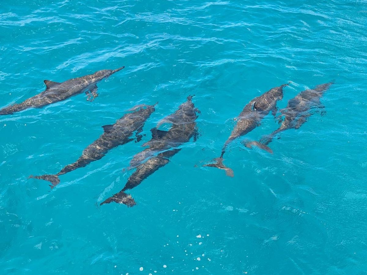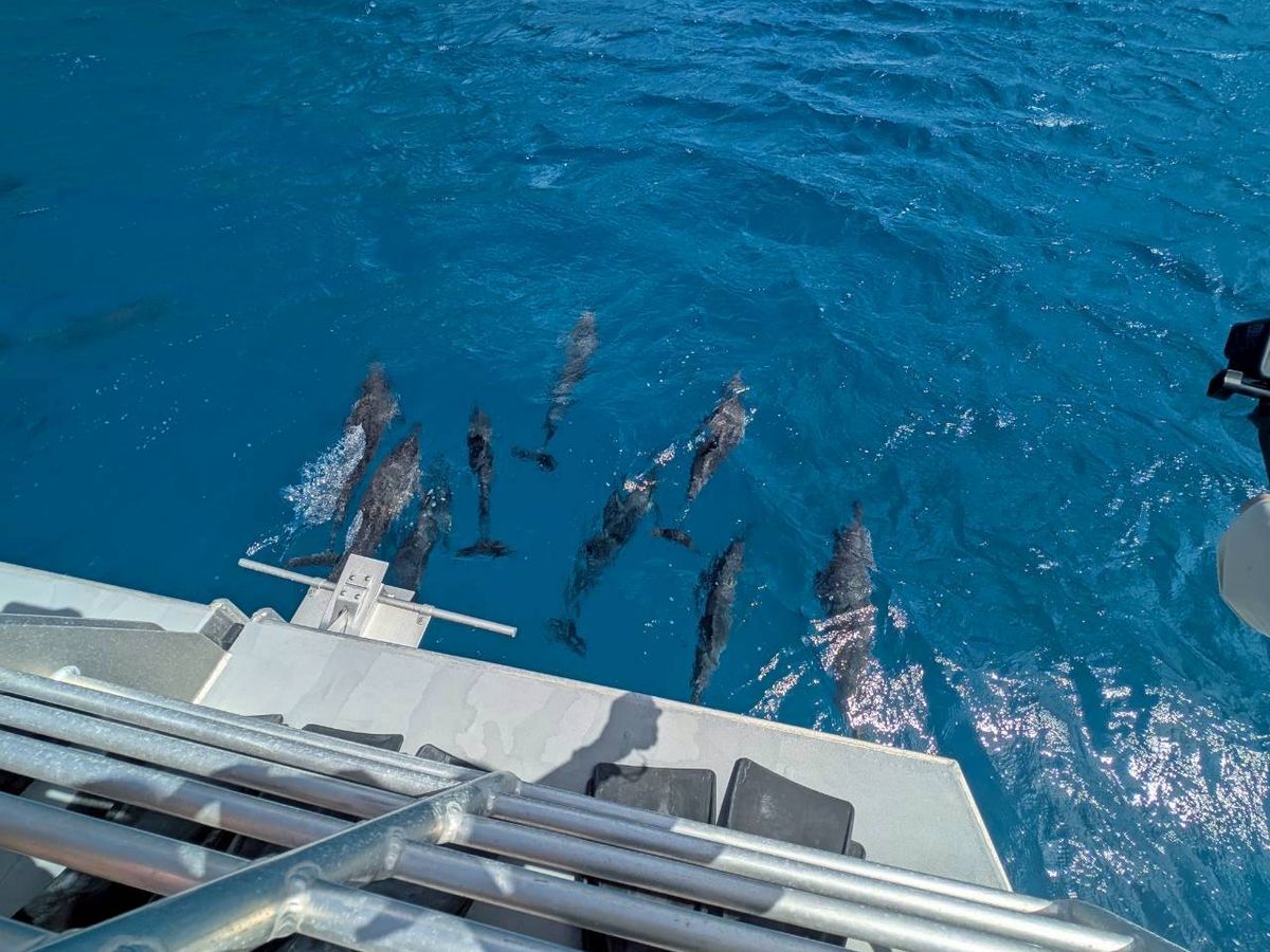 帰り道ではハシナガイルカの群れに遭遇し、赤ちゃんイルカまで見られました。ガイドさんによると、2年間イルカ大学で働いていて「会えなかった日はない」とのこと。船と並走したりジャンプしたりと、野生のイルカと過ごす特別な時間に子どもも大興奮でした。