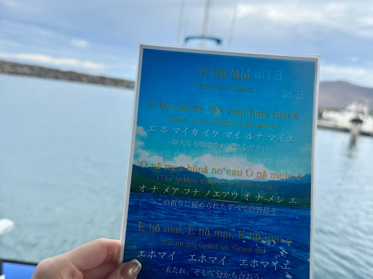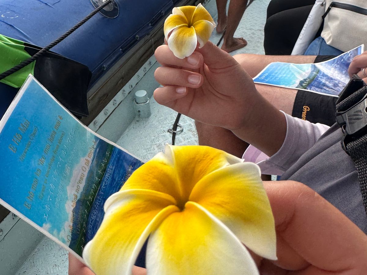 船には日本人インストラクターさんがいるので安心です!ハワイ語で祈りの歌を歌ってプルメリアをみんなで海に投げる儀式がとてもよかったです。