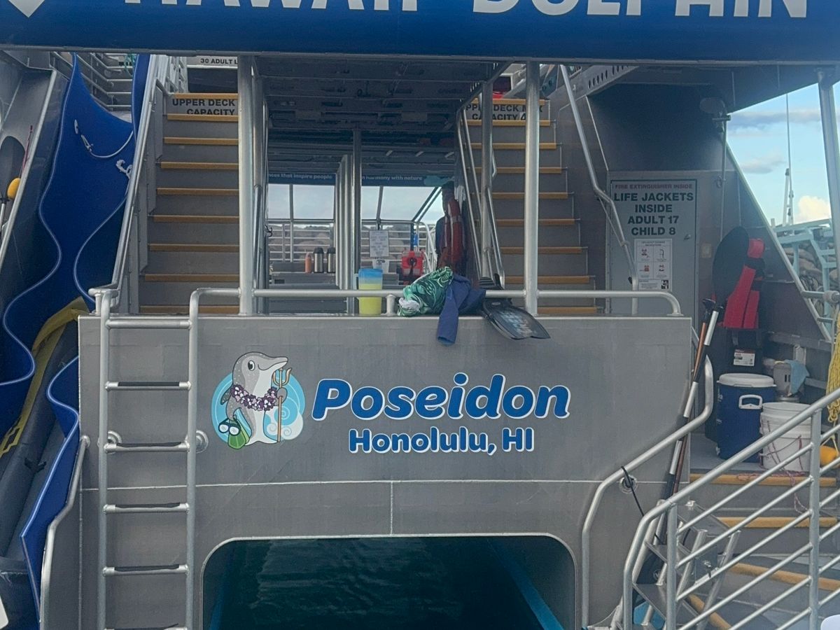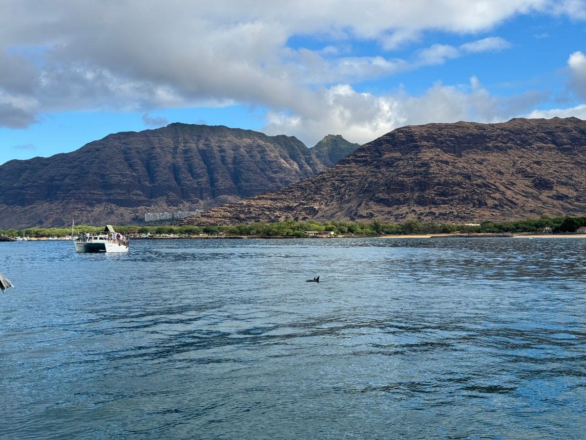 天候に恵まれて、ホテルを送迎バスで10時40分ごろ出発。出航する前にアザラシ出会って早くも感動をいただきイルカ大学が始まりました。西オアフ島をクルージングする中で大海原の美しさ、大自然の残る山、山、美しい地平線を満喫することができました