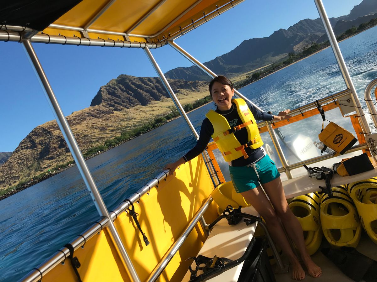 マキさんに素晴らしいアテンドをいただき、とても楽しく貴重な時間を過ごすことができました。行きの船上ではイルカに逢えるか少し不安になりましたが、そんな不安も全く嘘のよう。バッチリ!青い海でイルカと一緒に泳ぐことが出来ました。あんなに近くでイルカと一緒に泳げるなんて、まさに夢と感動の一時でした。そして、何とウミガメにもたくさん出会えるではないですか。帰りは船上でウクレレに合わせてフラダンスを踊りながら最後の最後まで楽しい時間を過ごすことができました。本当に素敵な思い出になりました!