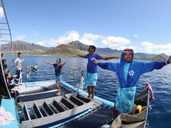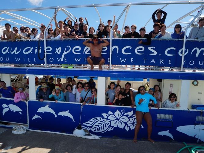 イルカがなかなか現れず、諦めムードのなか船上でクルーの陽気なフラダンスで盛り上がりはじめると、イルカ出現!時間的に一緒には泳げなかったけど、沢山のイルカが船上から見れました。ジャンプしているところも!おばさん3人組でしたが、初カヤック、滑り台、シュノーケリングとてもたのしかったです。1人船酔い心配でしたが送迎バスの中で買った酔い止めブレスレット効果的面!ランチのハンバーガーも美味しく、クルーのみなさんも親切で楽しく最高でした。また、ハワイに行ったら参加したいです。