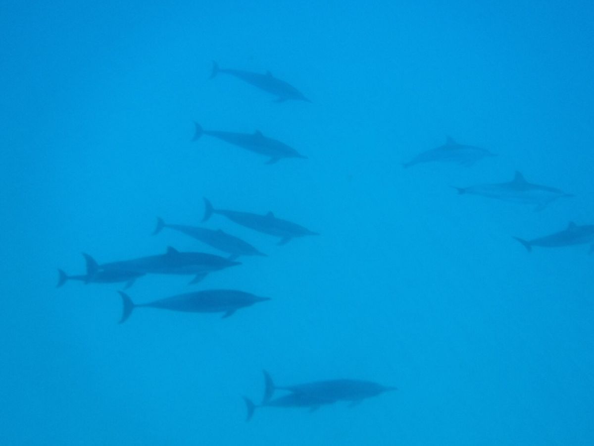 船の上からイルカの群れを見れたのは良かったのですが、海の中でのイルカの姿を見る事は思ってたほど容易ではなかった。インストラクターの合図で一斉に船から海へダイブしてイルカの姿を必死に探すを5、6回繰り返し、結局見れたのが2回ほど、それもあっという間。カメも、海面に甲羅が浮いている姿を発見。その後は海底にうっすら姿が見えたくらいだった。シュノーケリングも天候のせいか、なかった。