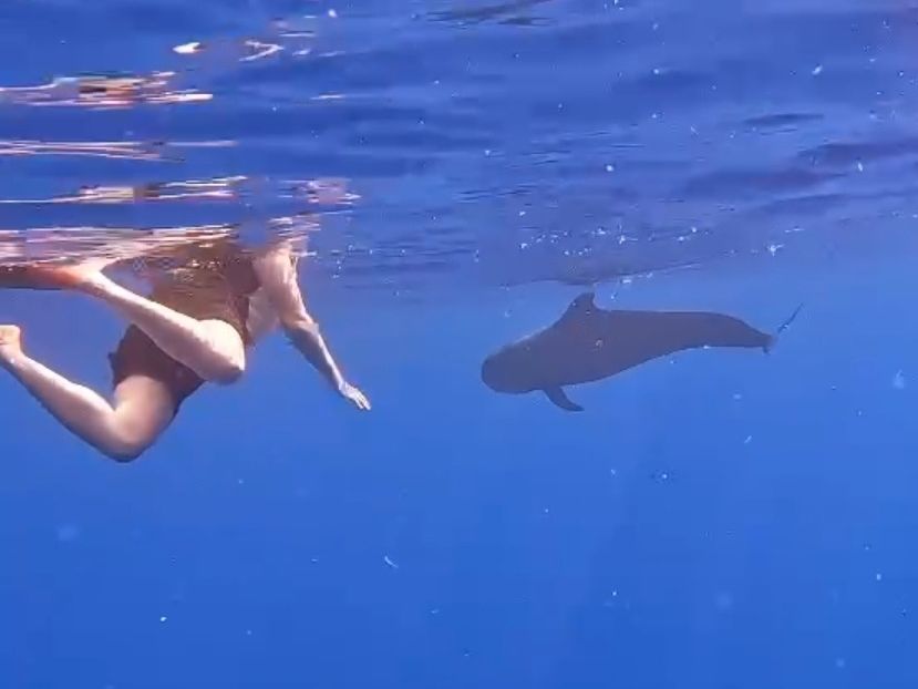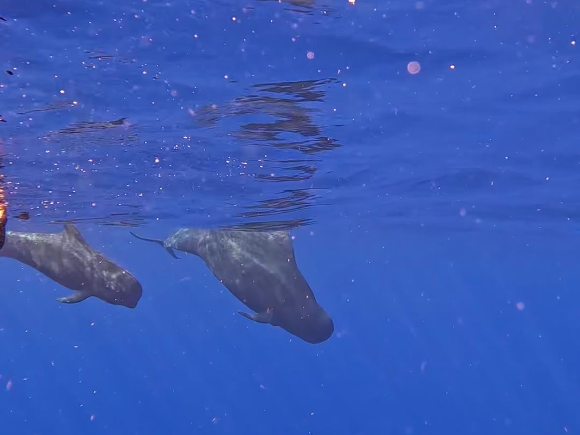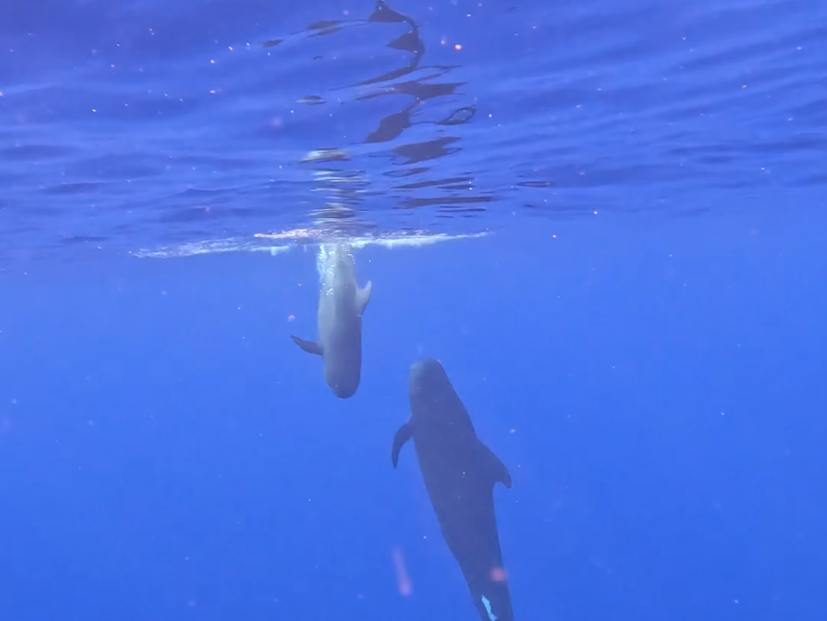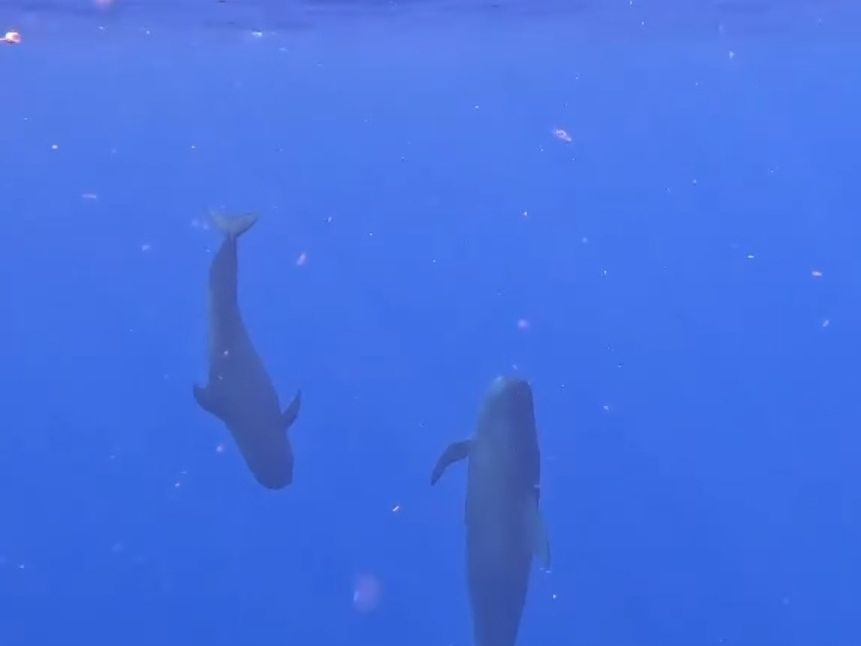 お父さん、お母さん、子供の3頭で、最初のうちはお父さんが警戒していましたが、敵ではないと分かったらしくお母さんが子供に呼吸の仕方を、私達の目の前で何度も繰り返しトレーニングしてくれました!何度かは真下から上がって来て、少し怖いぐらいでした(笑)その後さよならしたのですが、何と!再びお母さんと子供が戻ってきて、子供を紹介する様に、再び私達に泳いでいる子供を見せにきてくれました!!